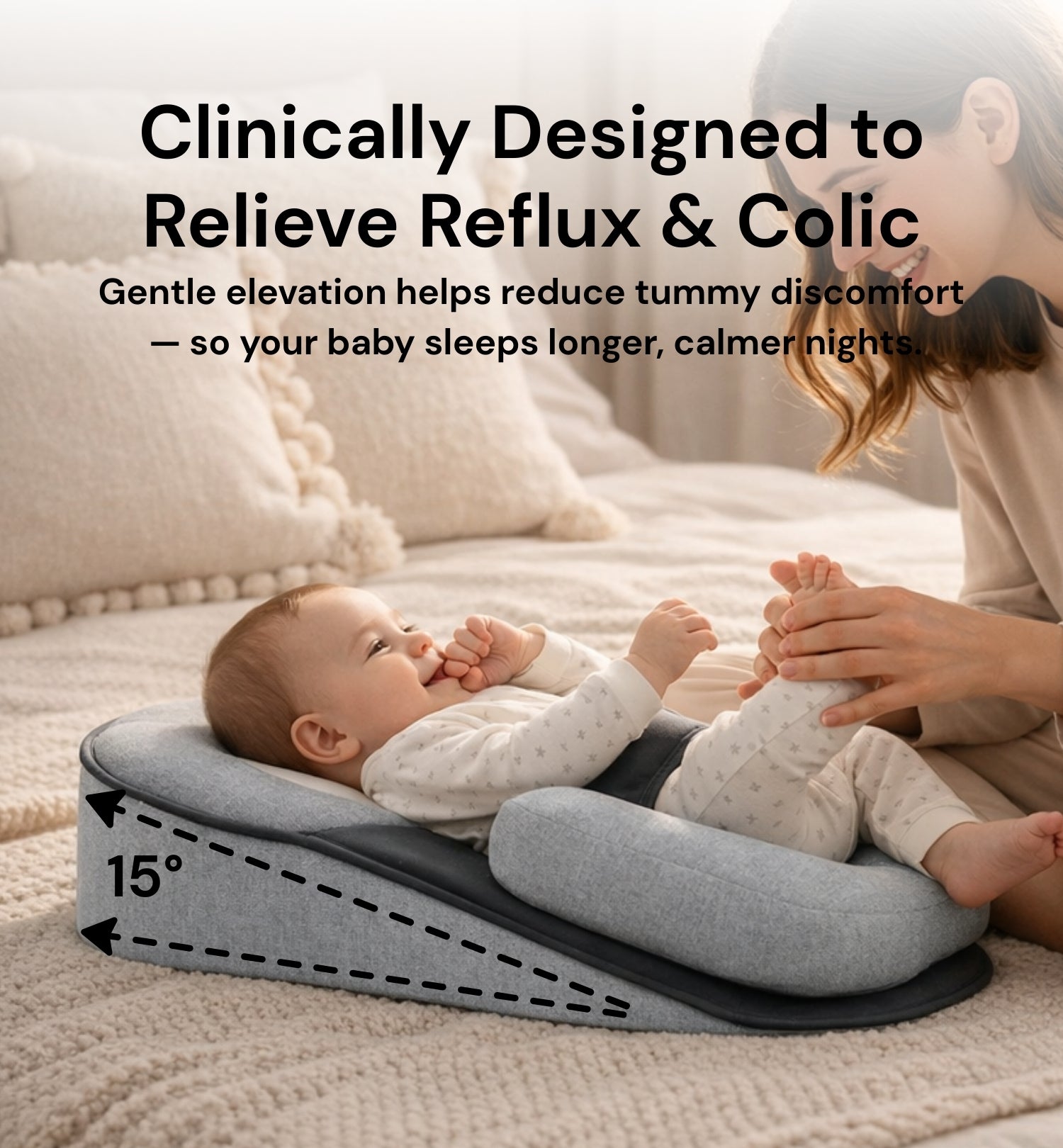 BabyBliss™ Nest holds your baby at a gentle 15° incline — the same position used by NICU nurses to relieve reflux and keep milk down.